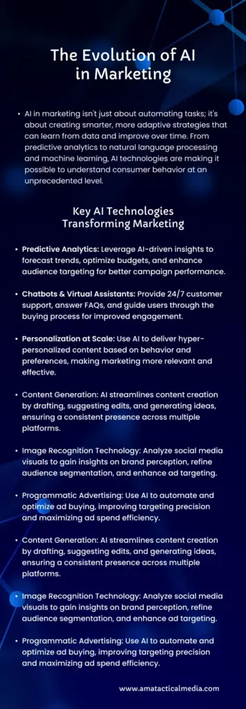 AMA Tactical Media has harnessed the power of AI to enhance predictive analytics, enabling precise targeting and optimization of marketing campaigns for maximum efficiency. Our AI-driven personalization tools allow us to deliver highly relevant content to diverse audiences at scale, significantly boosting engagement and conversion rates. Additionally, by leveraging advanced chatbots and virtual assistants, we provide exceptional customer service, enhancing user interactions and satisfaction.